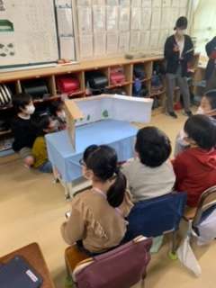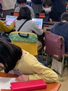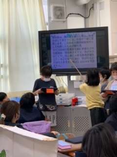 3年生の総合的な学習の時間に、カイコの世話や観察をしたり、調べたりしたことを新聞や人形劇、プログラミングなどを用いてまとめています。今日は発表するために、ペアのグリープで聞き合い、アドバイスをしました。