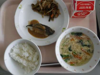 本日の献立 ごはん 牛乳 魚のごまだれかけ くきわかめの炒め煮