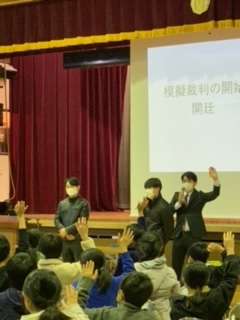 今回の模擬裁判シナリオの劇中で、自分たちが目撃した人物のことについて、記憶を頼りにワークシートに記入し、友達と話し合いました。その後登場した2人の人物は、そっくりです。1人を選び、模擬裁判が始まりました。
