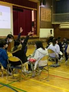 刑事裁判シナリオに沿って、冒頭手続き、証人尋問、弁護人反対尋問、弁護人主尋問、検察官反対尋問を裁判官、検察官、弁護人の役割を子どもたちも担当しながら進みました。子どもたちから質問も挟みながら評議に入りました。グループに分かれて、被告人が犯人かどうか判断していきました。有罪か無罪か理由と共に考えました。