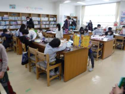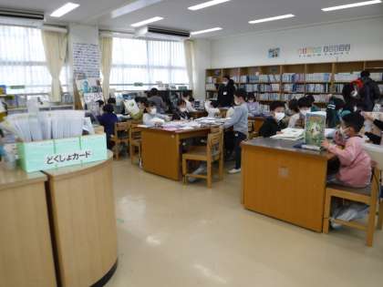 教室から図書室に移動して図書の時間を過ごします。図書館司書の方に読み聞かせをしていただいたり、好きな本を選んで自分で読んだりしました。本を借りて持ち帰る子もたくさんいました。読んだ本や借りた本を記録する図書カードも随分たまりました。