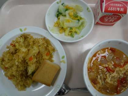 本日の献立 ツナピラフ 牛乳 アクアコッタ 白菜とコーンのサラダ