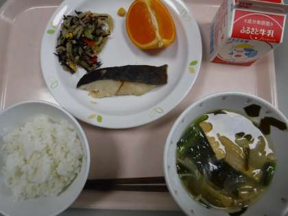 本日の献立 ごはん 牛乳 魚の西京焼き 大根とひじきのサラダ みそ汁 せとか