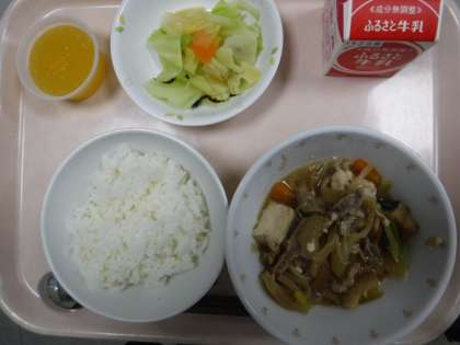 本日の献立 ごはん 牛乳 肉豆腐 キャベツの塩こんぶかけ フルーツゼリー