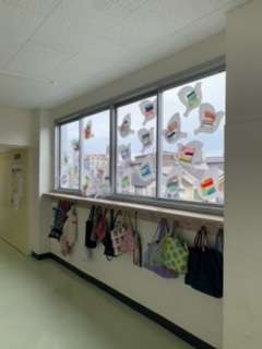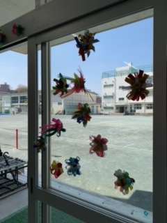 卒業式を前に、各学年が卒業を祝って飾りをつくりました。校内を彩っています。