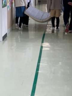 6年生は、卒業式と入学式のために片付けていた体育館のマットや跳び箱などの体育用具を元の場所に戻す作業をしました。各教室では、自己紹介をし合いました。