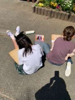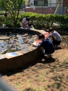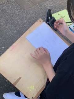 5年生の図工。外に出て「季節をす感じる場所」を見つけてよく見てスケッチをしました。いろいろな形を組み合わせてかくことを楽しみました。