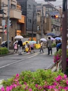 土曜授業日です。雨の中、元気に登校してきた子どもたちです。土曜日の登校は、主事さんの他に、おやじの会繋組の保護者の方々が交通安全を見守ってくださっています。