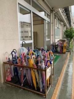 1年生も6年生に教えてもらいながら傘を巻いて、上手に傘立てに置くことができました。
