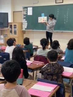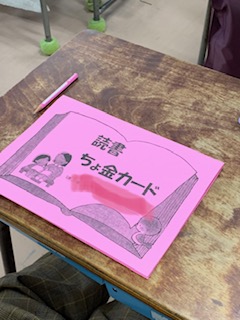 2年生の教室です。今日の図書の時間は担任の先生からの読み聞かせがありました。「読書ちょきん」カードに記録しながら、「本とも友達」になっていきます。
