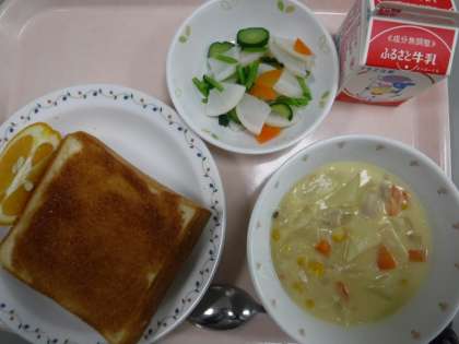 本日の献立 シナモントースト 牛乳 チャウダー 野菜のレモンかけ 甘夏みかん