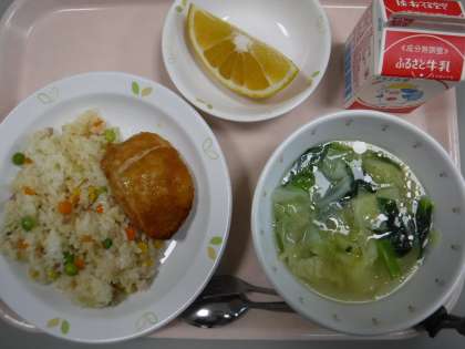 本日の献立 三色ピラフ 牛乳 鶏肉のカレー焼き ヌードルと野菜のスープ 河内晩柑