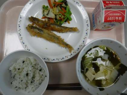 本日の献立 わかめごはん 牛乳 ししゃものごま揚げ 豆腐汁 野菜のおかかかけ