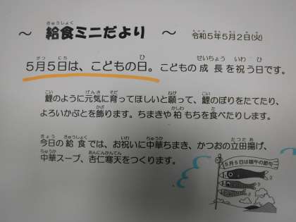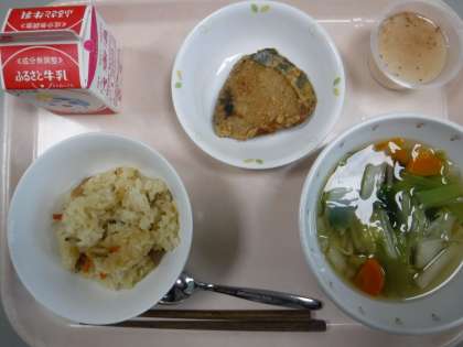 本日の献立 〜こどもの日献立〜 中華おこわ 牛乳 魚の立田あげ 中華スープ