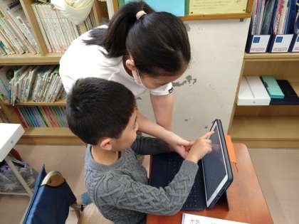 6年生がパソコン先生として、「iPadマスターへの道」を見ながら