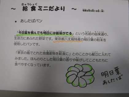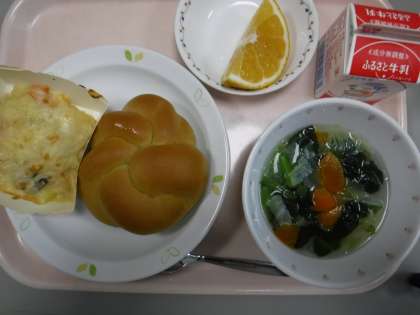 本日の献立 あしたばパン 牛乳 豆乳入りポテトグラタン 野菜スープ 河内晩柑