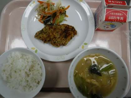 本日の献立 麦ごはん 牛乳 魚のごまフライ 野菜の和風ドレッシング みそ汁