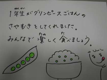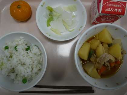 本日の献立 グリンピースごはん 牛乳 肉じゃがうま煮 大根とキャベツの甘酢かけ