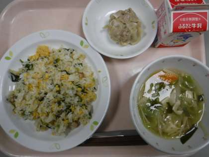 本日の献立 青菜のチャーハン 牛乳 ジャンボしゅうまい わかめスープ