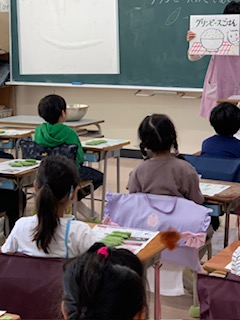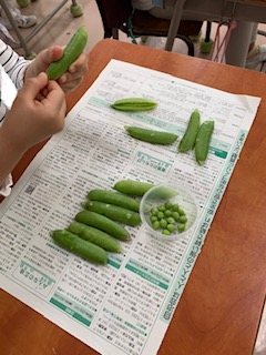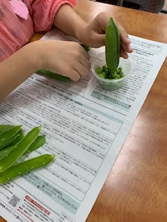 金曜日に1年生が、グリーンピースのさやむき体験をしました。栄養士の先生から説明を聞いて、楽しくさやむきをしました。この日の給食の美味しいグリーンピースご飯となりした。