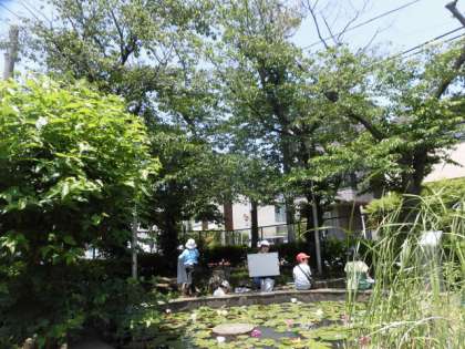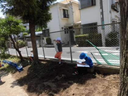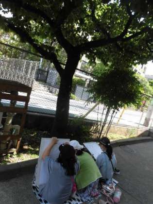 自分の好きな木を見付けて、好きな場所からかいて表す活動です。