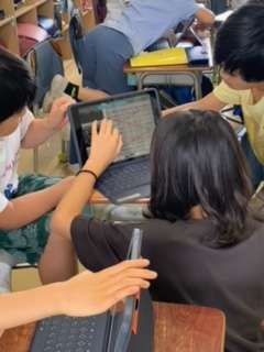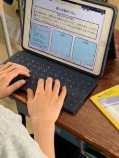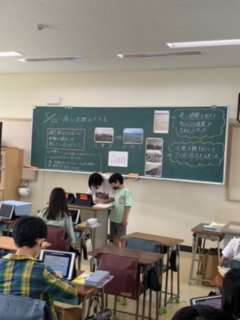 5年生の社会科です。昔と今の写真を比べたりしながら、みんなで単元目標を決めました。その中で今日の学習課題「嬬恋村はどのように作物の収穫が増えていったのだろう」を立てました。予想し、資料を基にしながら考えていきました。