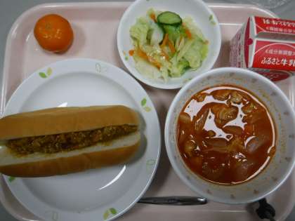 本日の献立 ドライカレーサンド 牛乳 ボルシチ 野菜のイタリアンドレッシングかけ