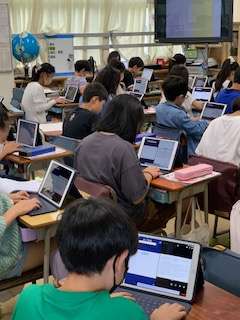 今年度から朝の時間を活用して、月に一回「デジタイム」を設けています。キュビナに取り組んだり、キーボードのダイビングに取り組んだりしています。写真は5年生の5分間に何文字打てるかの取組、4年生の教科書を活用してタイピングに取り組んでいる様子です。