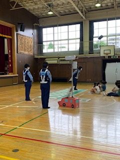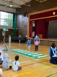 1年生が交通安全教室を行いました。世田谷警察署のお巡りさんに安全な道路の歩き方を教えていただきました。