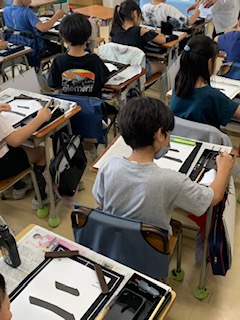 3年生から書写の時間には毛筆にも取り組みます。今日は、二回目の習字の時間でした。まずは、お手本をよく見て書きます。みんな真剣な表情で取り組んでいました。
