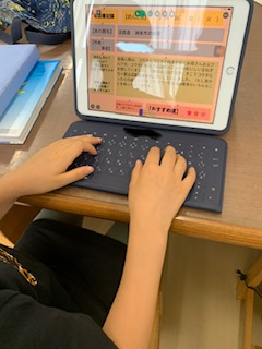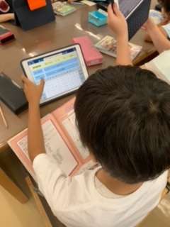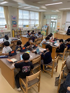 4年生の図書の時間。授業終わり近くになると、読んだ本の記録をする児童の姿が見られます。