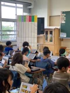2年生の生活科で取り組んでいます。子どもたちが選んだ野菜は、キュウリ、ナス、ゴーヤ、オクラ、トマト、ミニトマト、トウモロコシ、ピーマンなどなど。自分が育てたい野菜を一つ選んで「あいぼう」として、育てています。育てながら様子を見て、うれしいこと、困ったこと、心配なこと、解決したことなど、どんどん追究していきます。