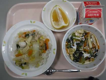 本日の献立 中華丼 牛乳 春雨スープ 河内晩柑