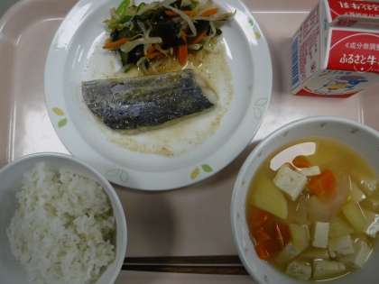 本日の献立 麦ごはん 牛乳 魚の梅肉焼き 海藻と野菜の和え物 みそ汁