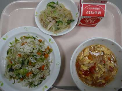 本日の献立 レタスとじゃこのチャーハン 牛乳 卵スープ バンサンスー