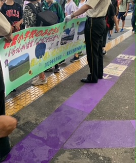 SLが駅に到着すると、駅の方々が横断幕を用意して駒繋小のお迎えをしてくださいました。横断幕は、プレゼントしていただきました。
