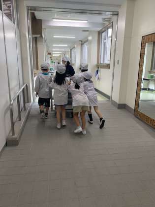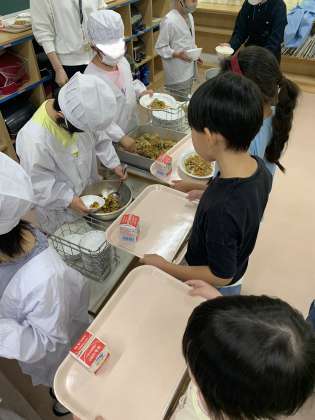 今日から給食が始まりました。久しぶりの給食です。約束やマナー、配膳の仕方などを振り返りながら用意をしました。写真は2年生の給食の話の学びの様子と1年生の配膳の様子です。