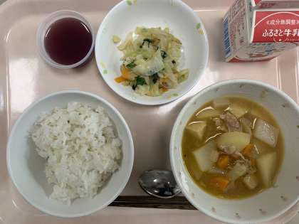 本日の献立 麦ごはん 牛乳 肉じゃがうま煮 キャベツのおかかかけ ぶどうゼリー