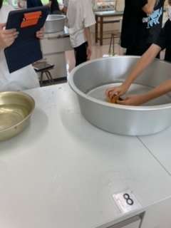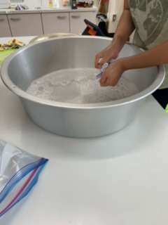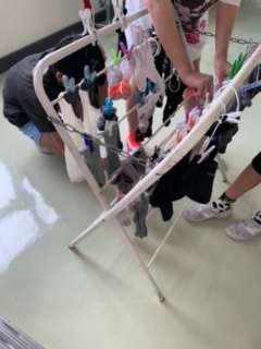 6年生の家庭科では、「夏をすずしくさわやかに」の学習をしました。靴下を手洗いし、洗濯の様子をタブレットで撮影し合って、洗濯についての振り返りに生かしました。