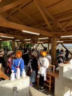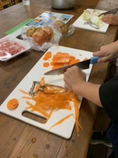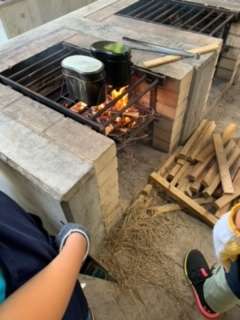 カレーづくり。野菜担当、飯盒担当、火起こしは担当と役割を決めて取り掛かりました。