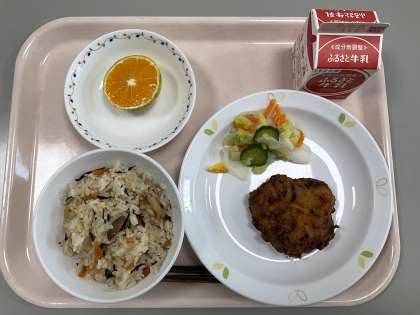 本日の献立 ひじきごはん 牛乳 手作りさつまあげ 即席漬 菊花みかん