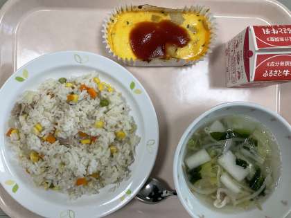 本日の献立 三色ピラフ 牛乳 スペイン風オムレツ 白菜のスープ