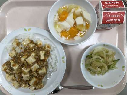 本日の献立 麻婆豆腐丼 牛乳 中華サラダ 杏仁豆腐