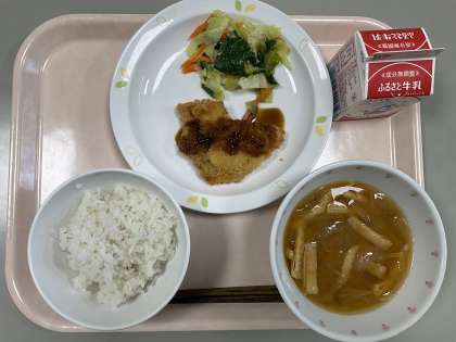 本日の献立 麦ごはん 牛乳 チキンカツ 野菜のカレードレッシング みそ汁