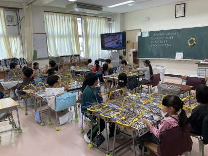 先週1年生は、育てていた朝顔の蔓を利用して、リースづくりを行いました。絡まる蔓を鉢からとって、輪っかにするのは難しそうでしたが、一生懸命に取り組みました。飾りをつけて、仕上げていきます。