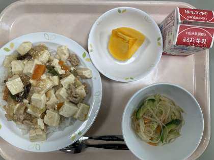 本日の献立 家常豆腐丼 牛乳 春雨サラダ 柿