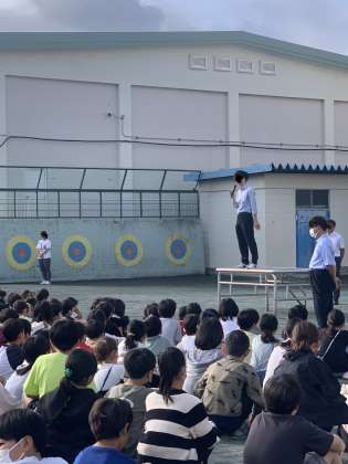 感染症と気候が落ち着いてきたので、校庭での全校朝会となりました。オンラインでの朝会も話がよく聞けてよいのですが、互いの学年のよさを直接感じることができる、集合しての朝会も大切にしています。