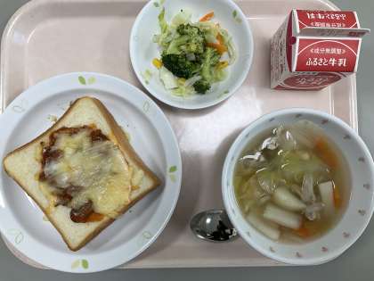 本日の献立 ピザトースト 牛乳 野菜のドレッシングかけ 白いんげんの田舎風スープ