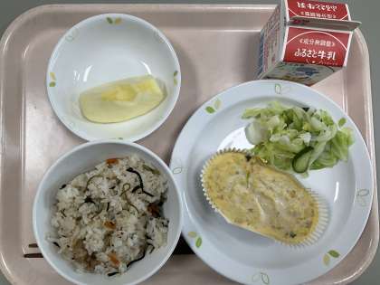 本日の献立 磯ごはん 牛乳 擬製豆腐 キャベツときゅうりの甘酢かけ りんご