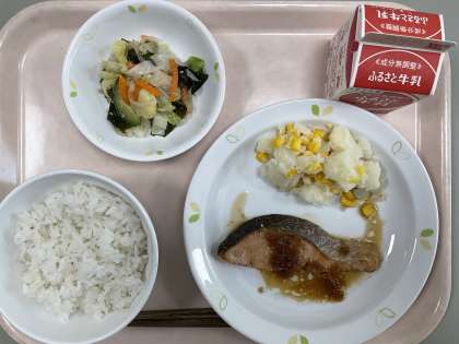 本日の献立 麦ごはん 牛乳 魚のステーキソース コーンポテト わかめサラダ